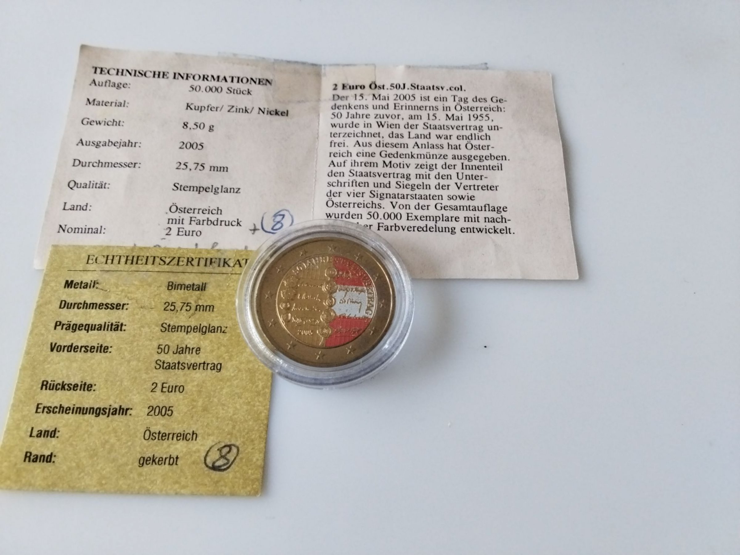 1 Stk. 2 Euro Gedenkmünze "50 J. Staatsvertrag" coloriert