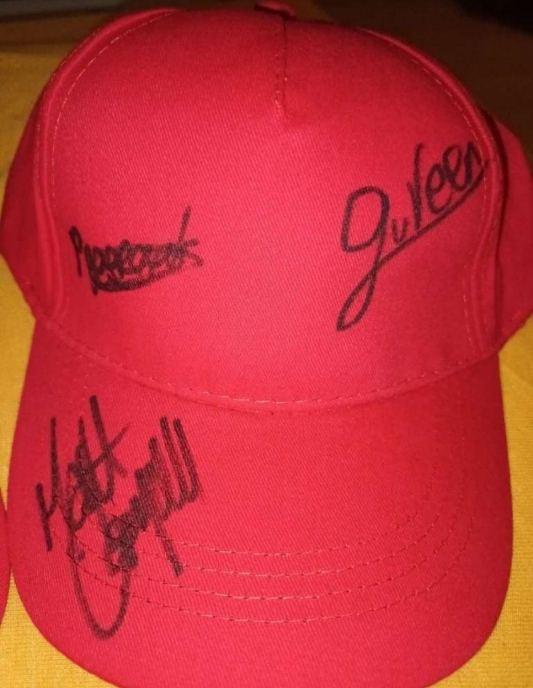 Neue rote Baseballcap unterschrieben signiert von den drei Dart Stars beim PDC Turnier in Graz, Patrick Geeraets, Matt Campbell und Gian van Veen