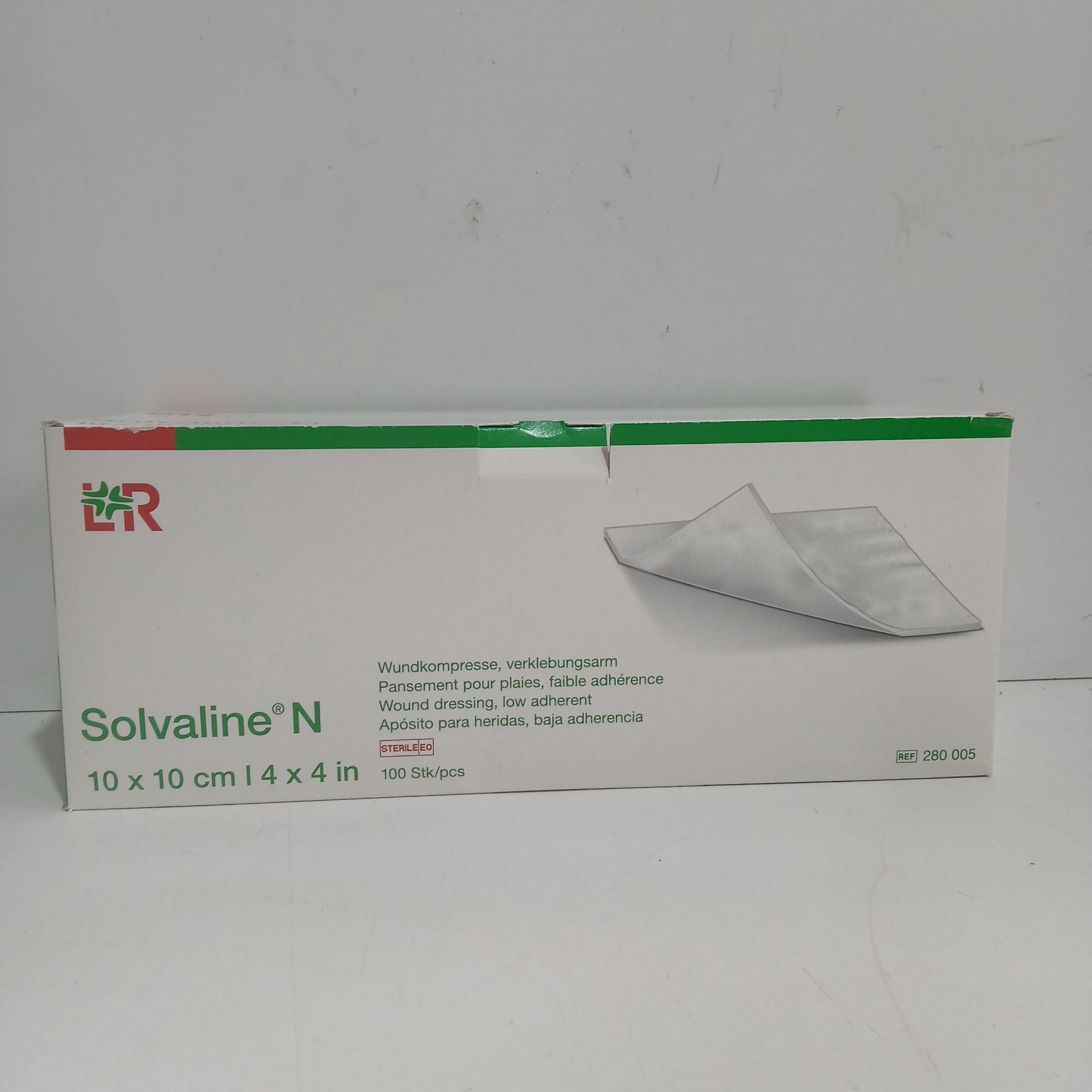 1 Packung LR Solvaline Wundkompresse verklebungsarm 10x10cm 100Stk