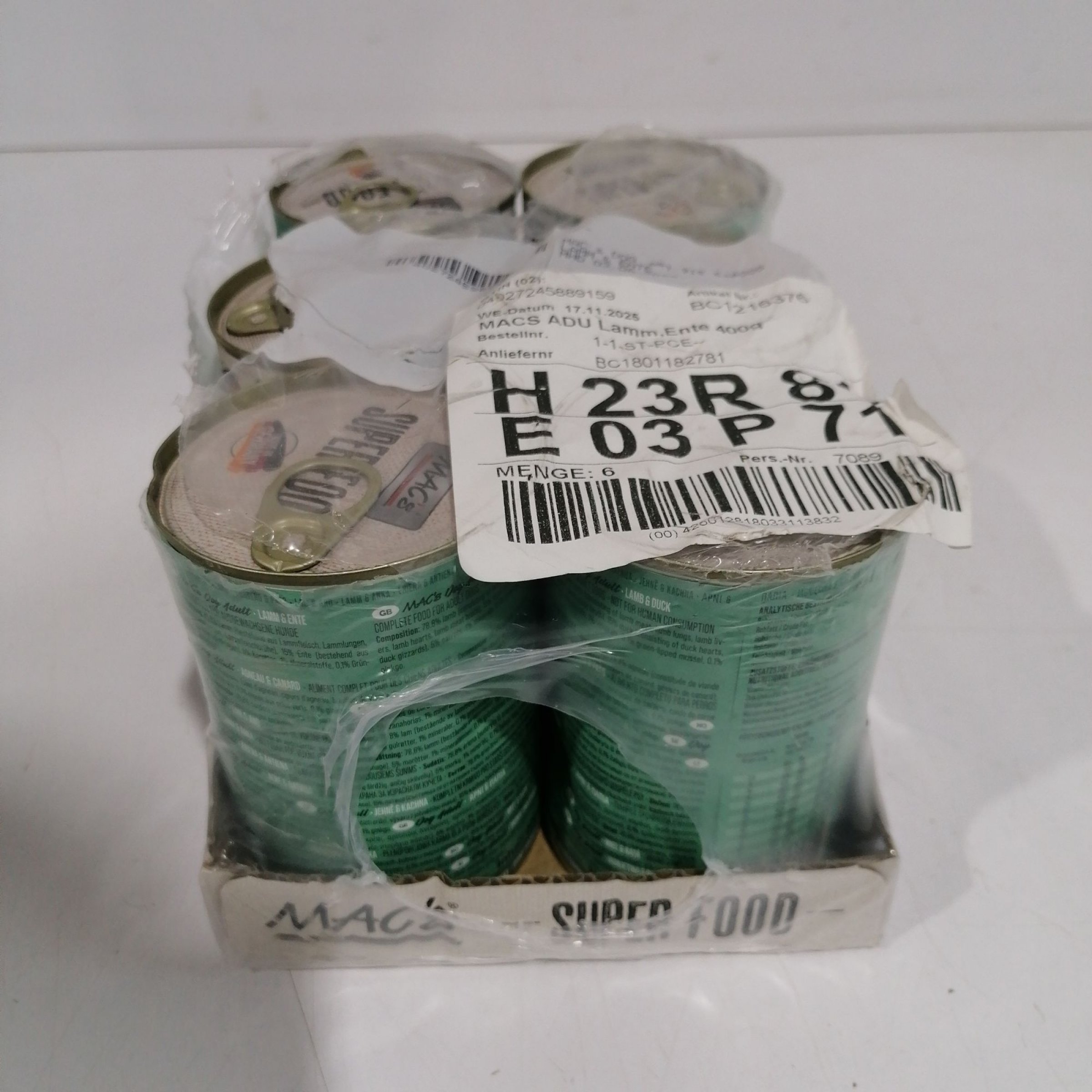 1 Packung Mac's Super Food Hund Lamm & Ente 6x400g