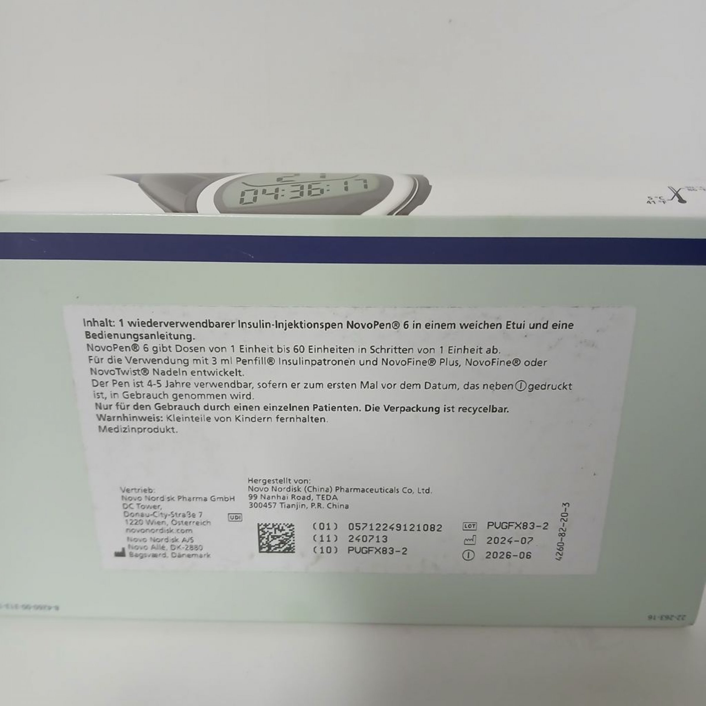 Inhalt: 1 wiederverwendbarer Insulin-Injektionspen NovoPen 6 in einem weichen Etui und eine Bedienungsanleitung. : 2026-02