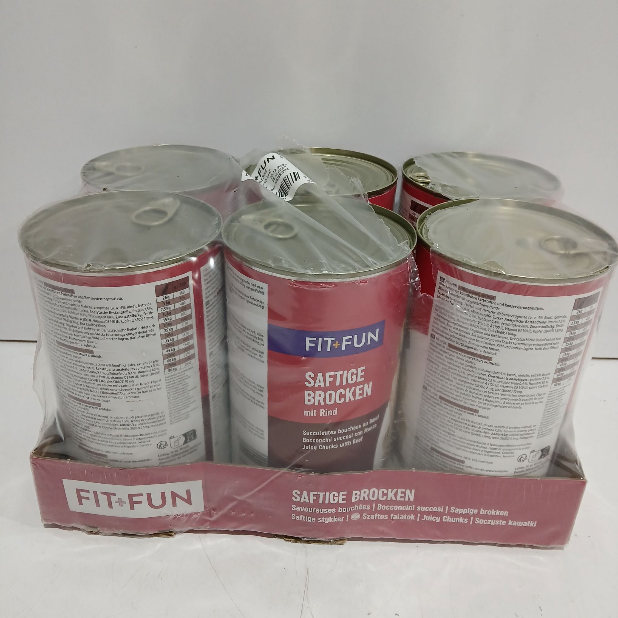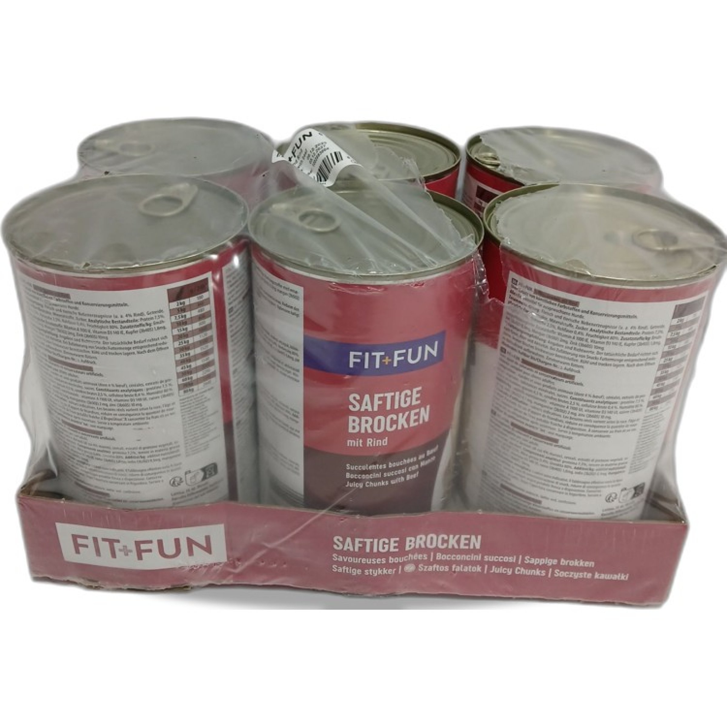 1 Packung Fit+Fun Saftige Brocken mit Rind 6×1240g