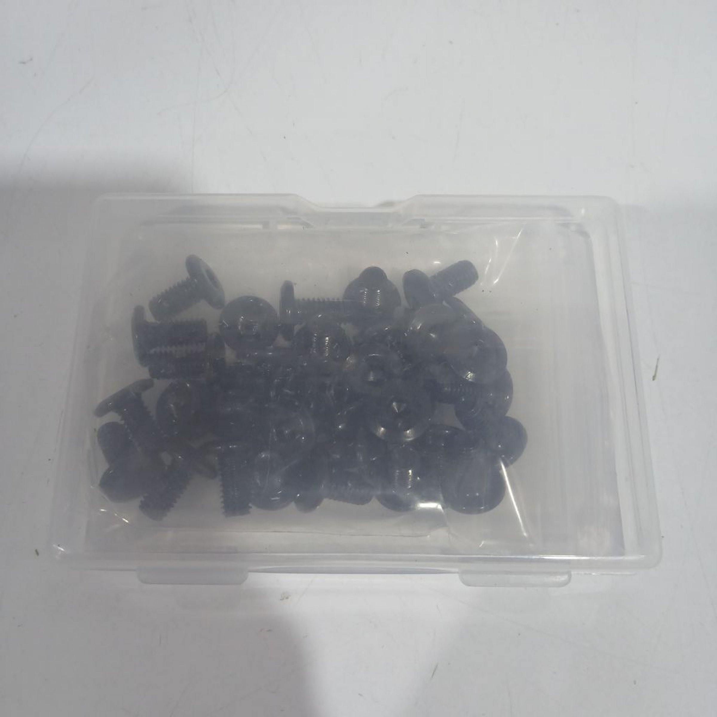 Enthält eine Vielzahl von schwarzen M6 Schrauben in einer transparenten Aufbewahrungsbox. Die genaue Stückzahl ist nicht sichtbar.