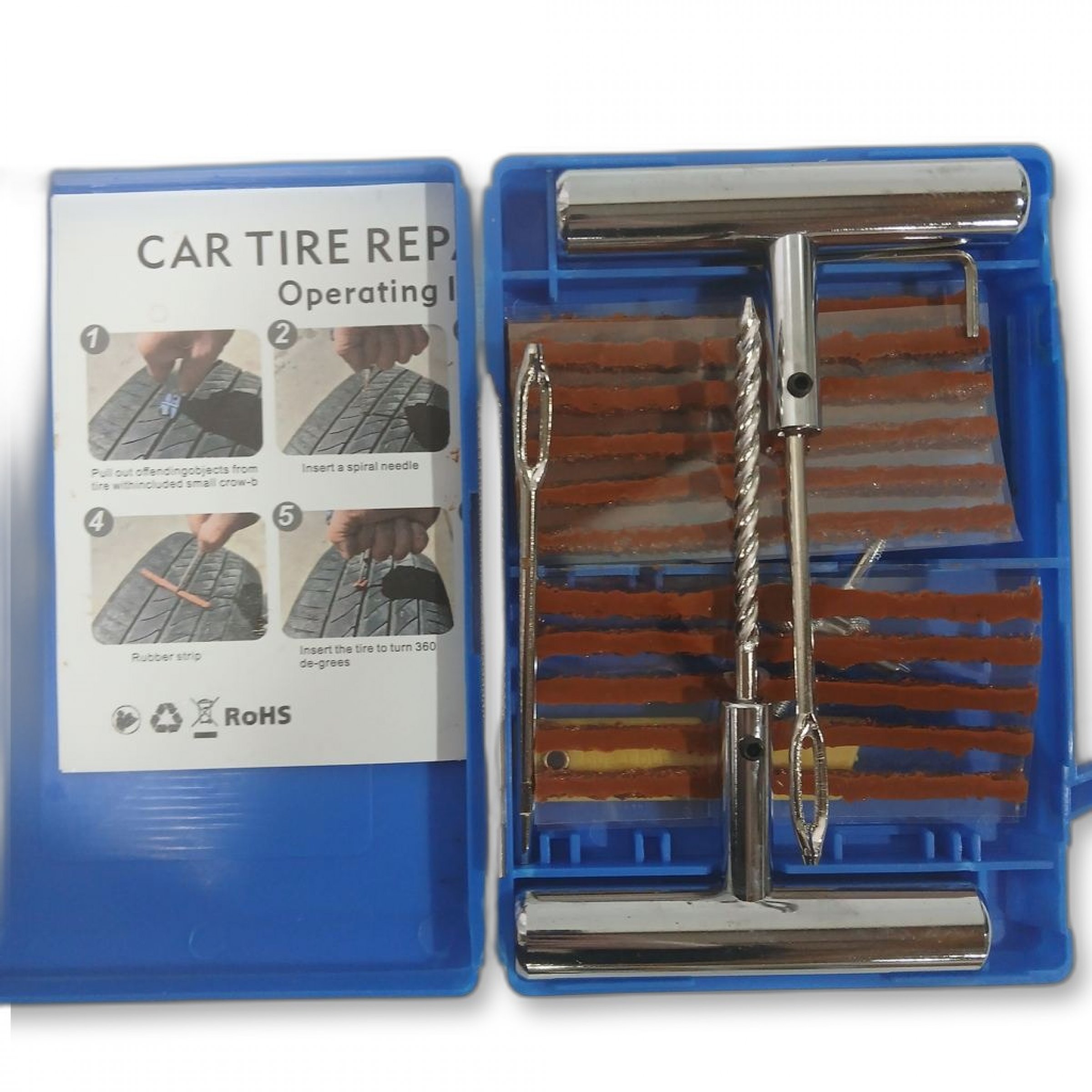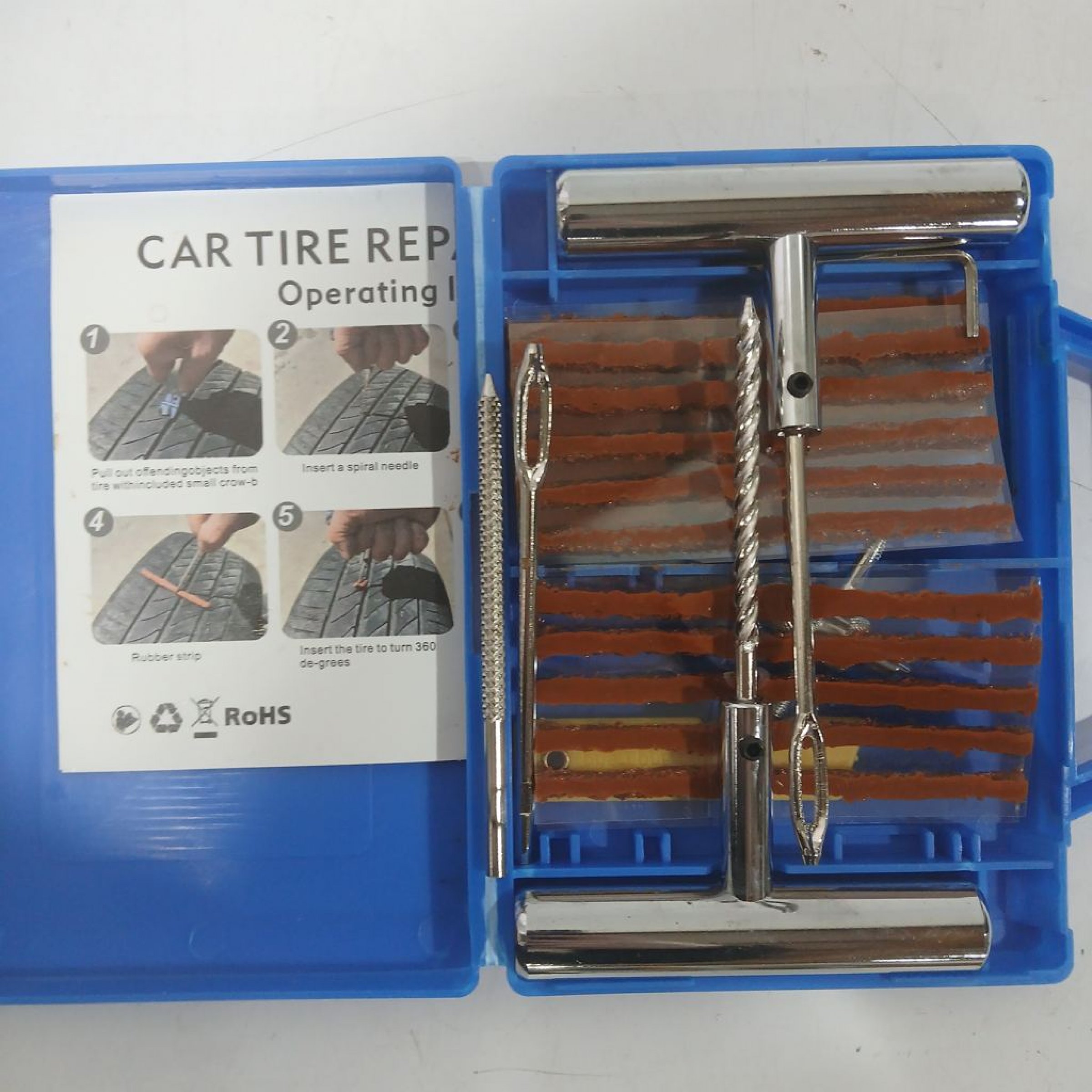 Enthält verschiedene Werkzeuge zur Reparatur von Autoreifen, einschließlich Spiralbohrer und Gummistreifen.