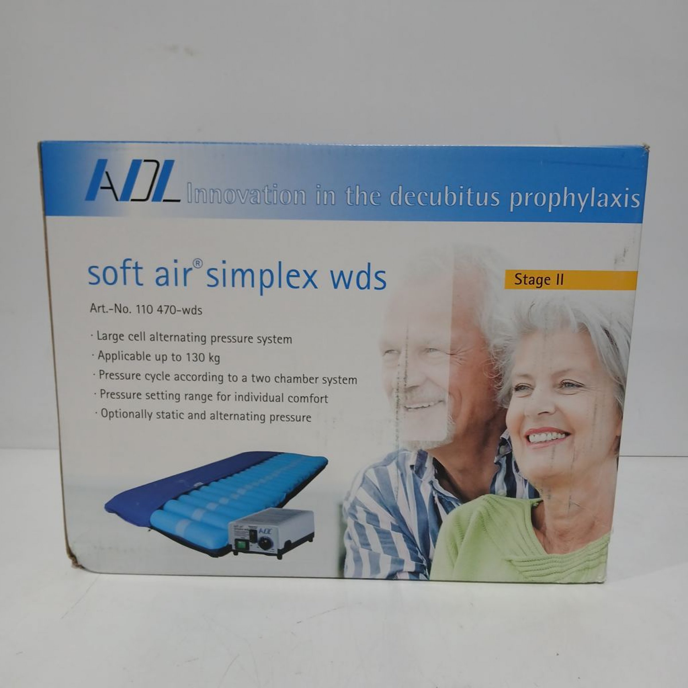 Große Zelle, alternierendes Drucksystem, geeignet bis 130 kg. Druckzyklus gemäß einem Zweikammersystem. Druckregelung für individuellen Komfort. Optional statischer und alternierender Druck