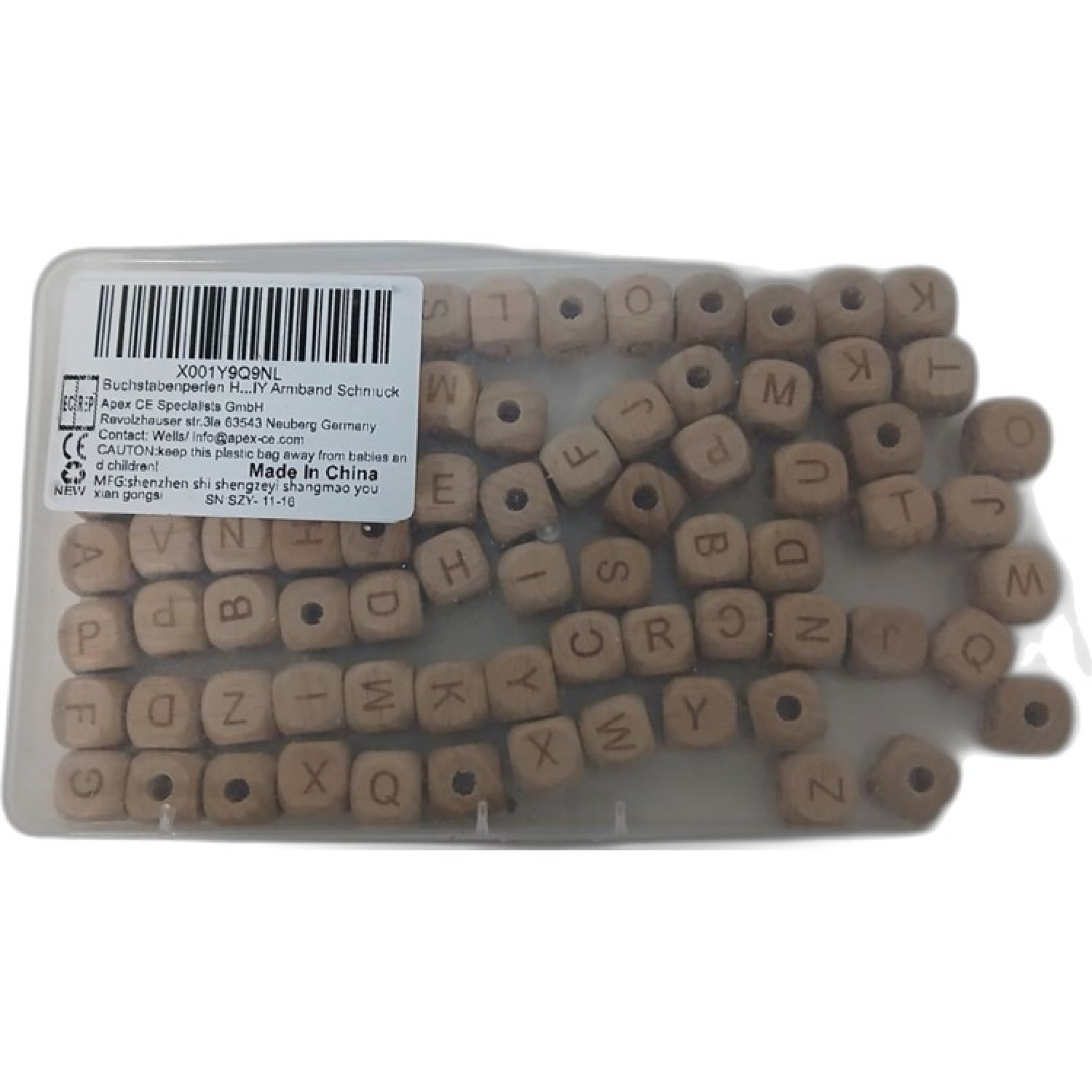 Set mit Holzbuchstabenperlen in verschiedenen Buchstaben.