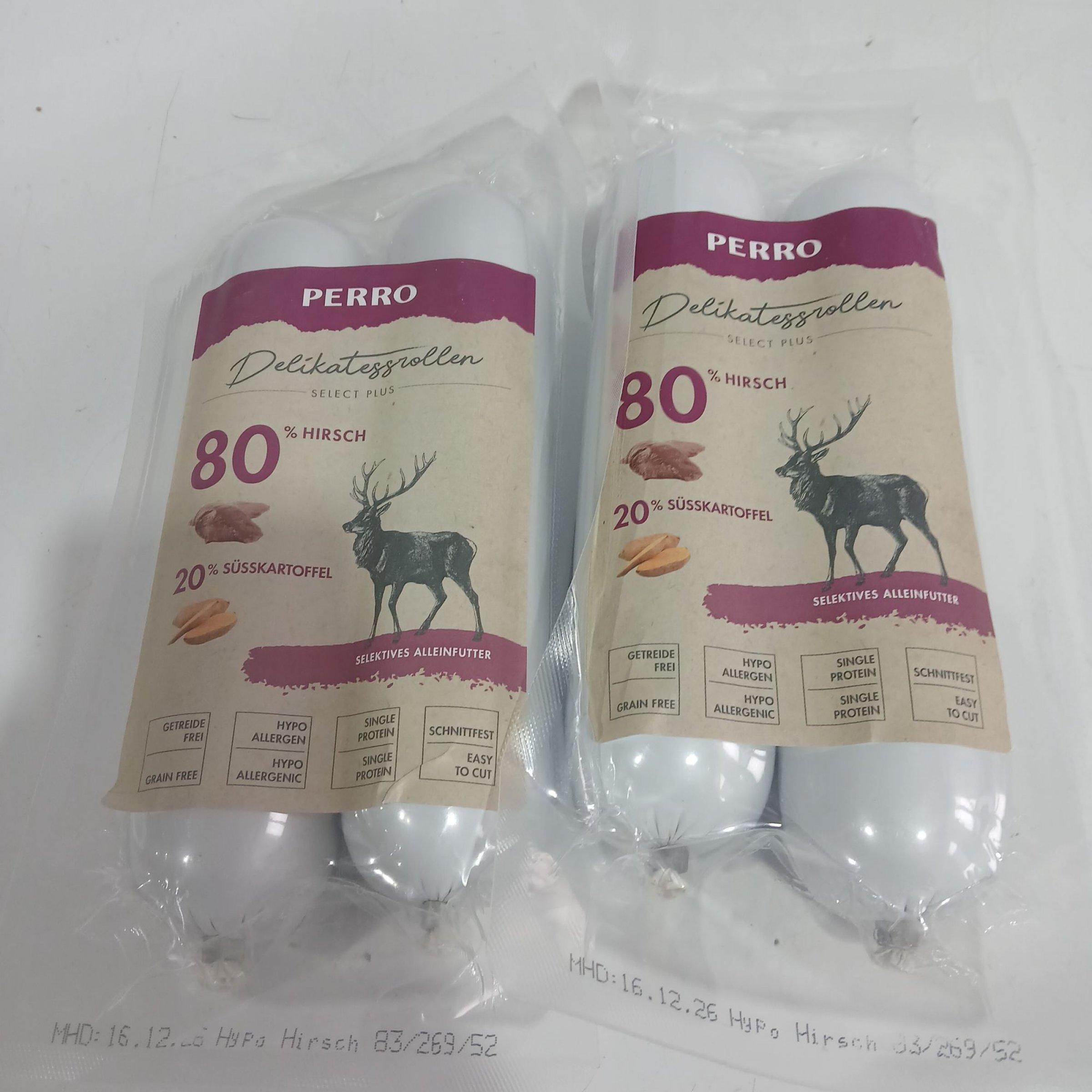 2 Stk. Perro Delikatessrollen 80% Hirsch 20% Süßkartoffel je 2x400g