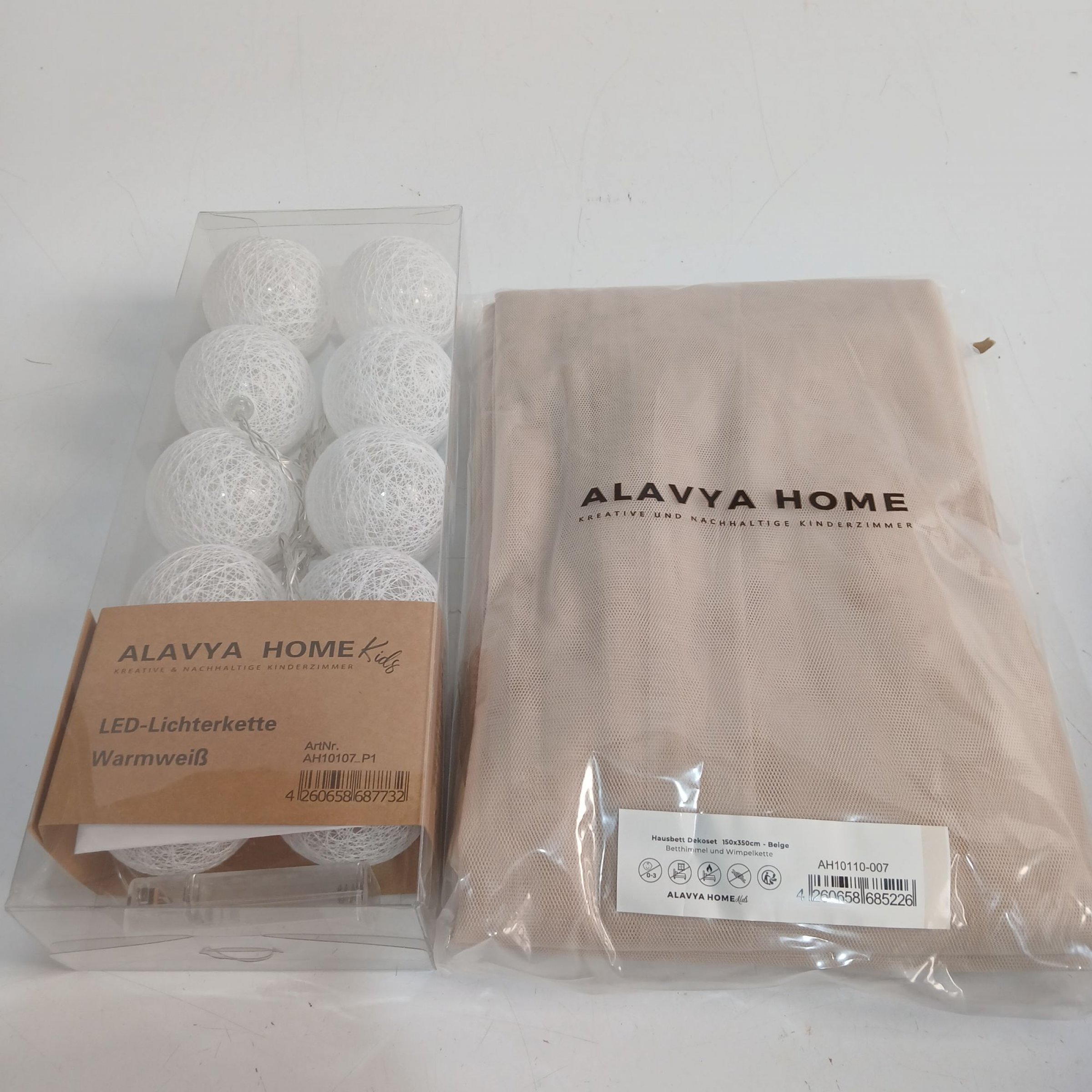 1 Stk. Alavya Home Hausbett Dekoset 150x350cm beige Betthimmel & Wimpelkette + LED Lichterkette warmweiß