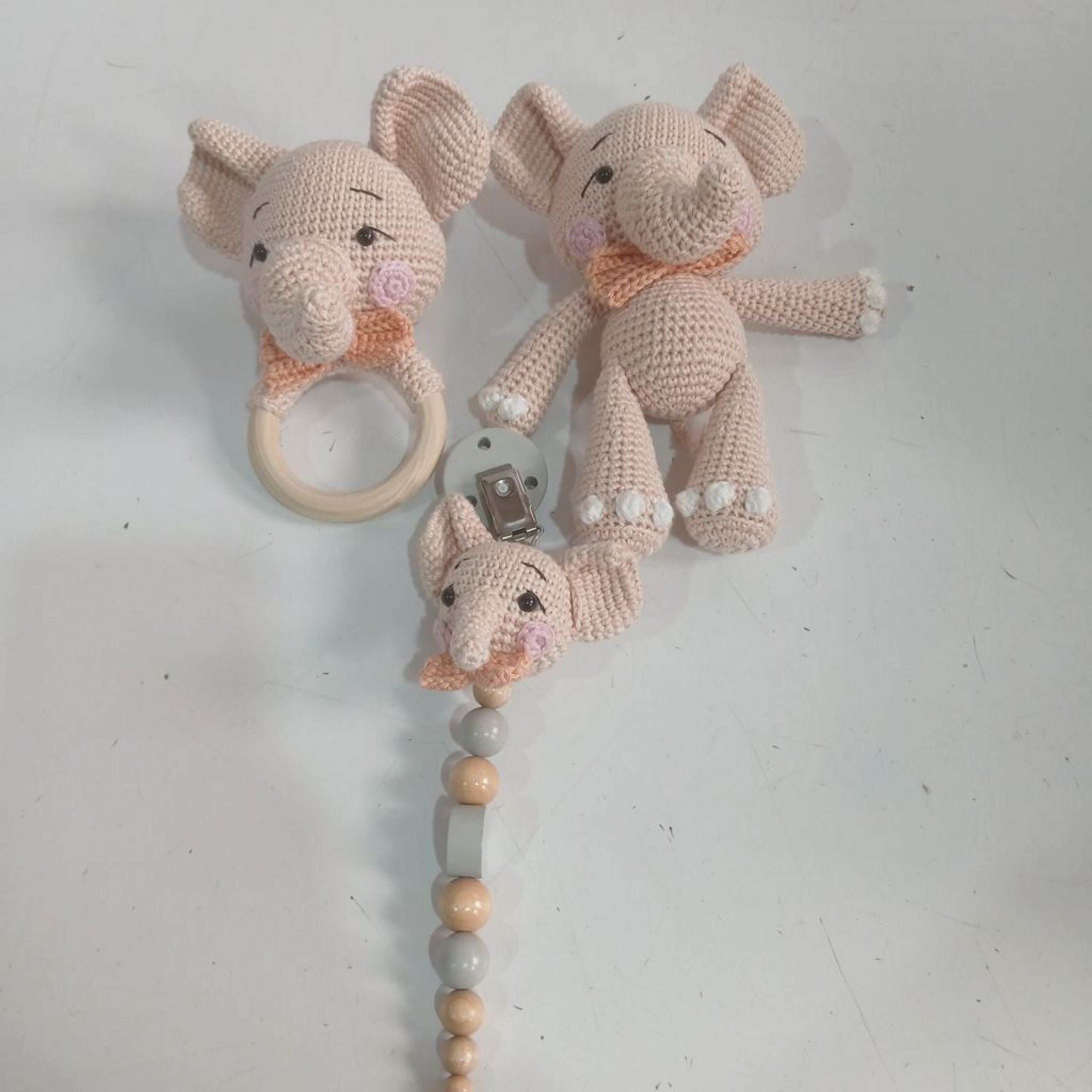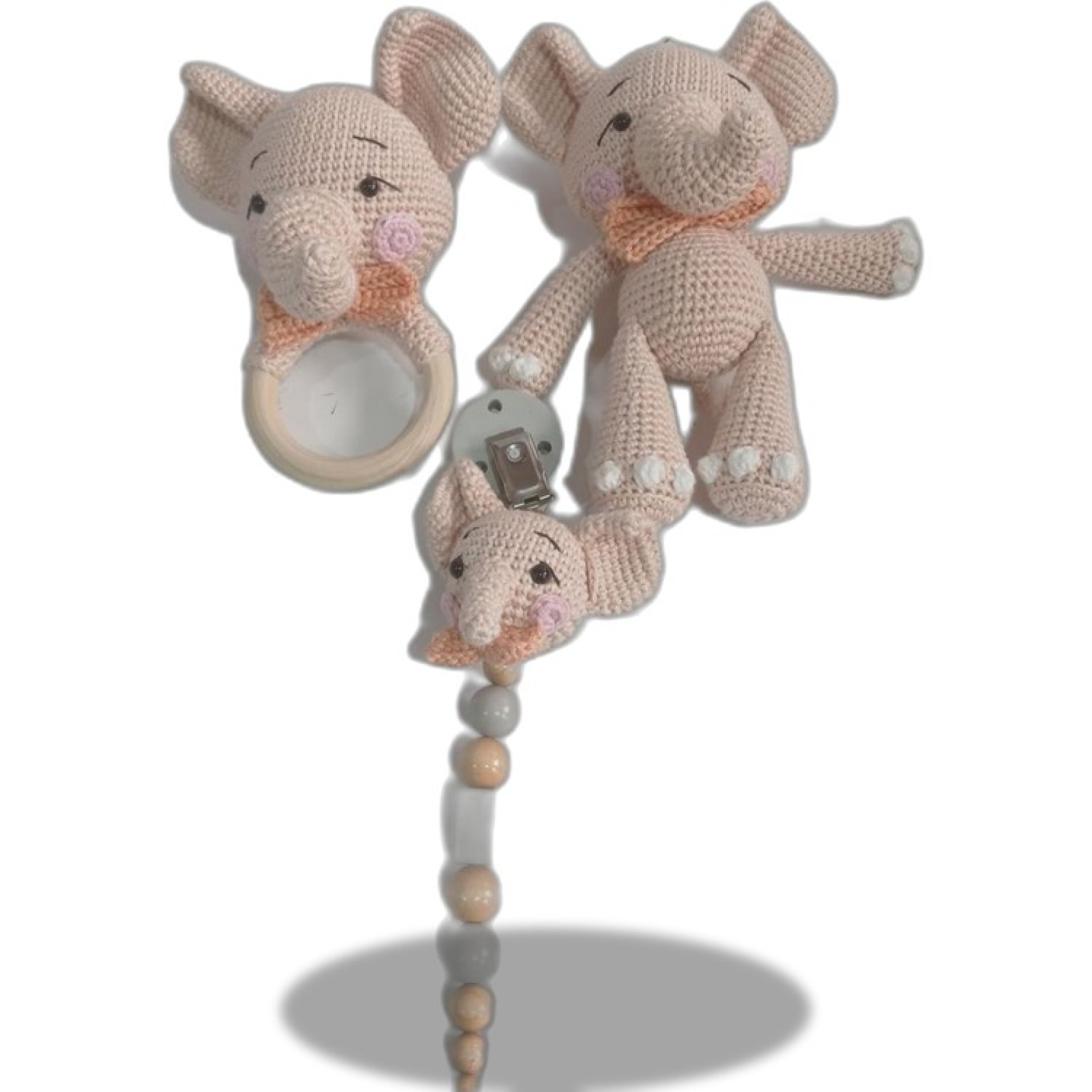 Enthält einen Greifring, Elefantenfigur und Schnulleranhänger