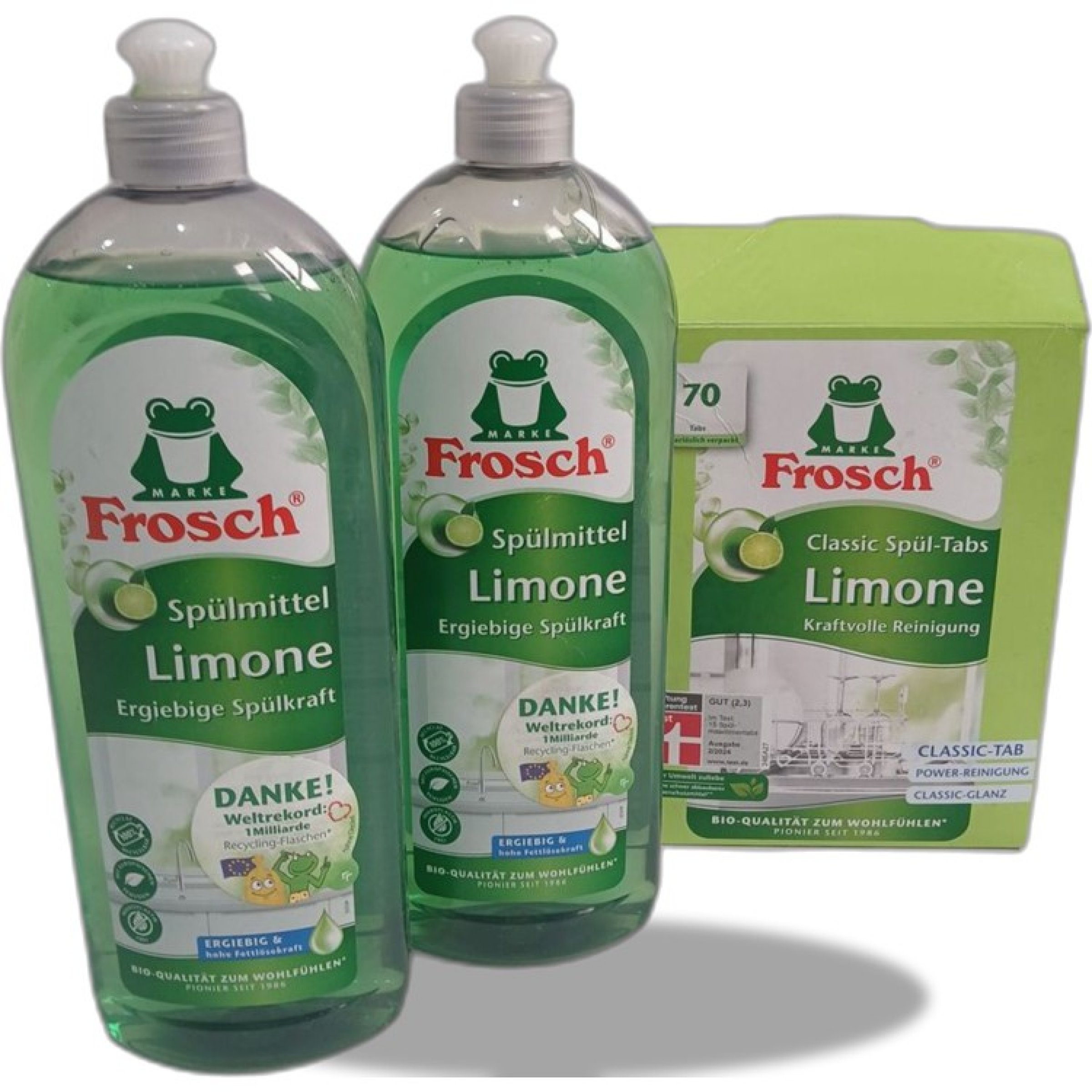 Inhalt: 2 Flaschen Spülmittel und 1 Packung Spül-Tabs