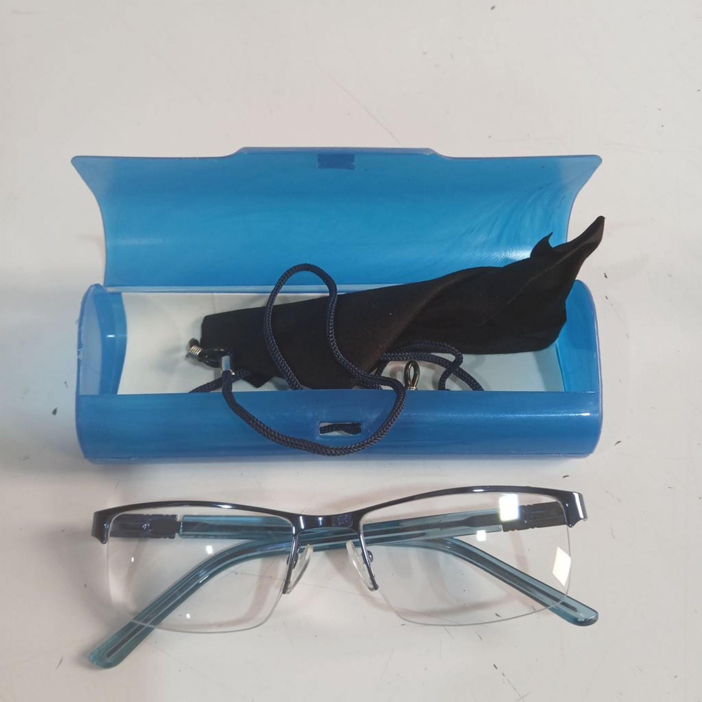 Brille mit transparenten Gläsern und einem blauen Etui