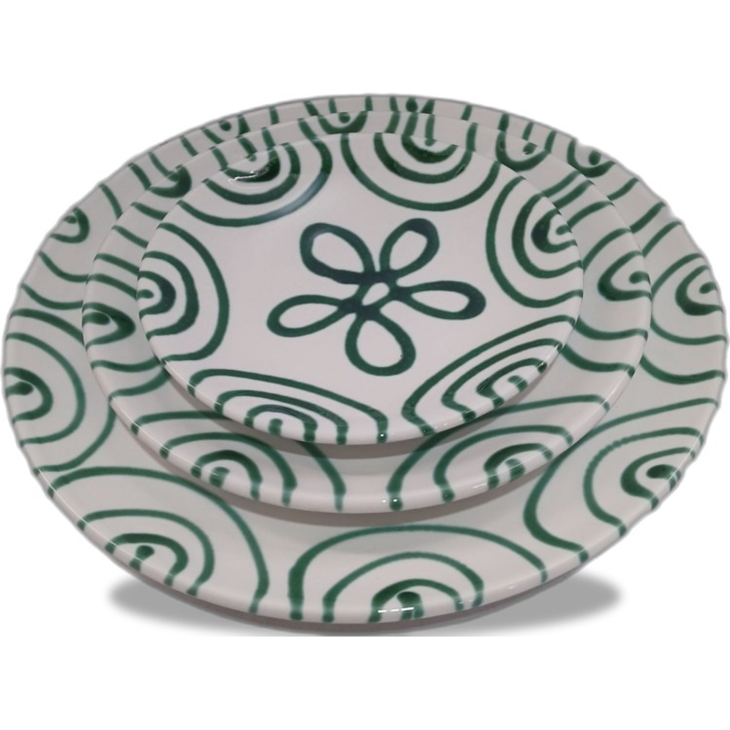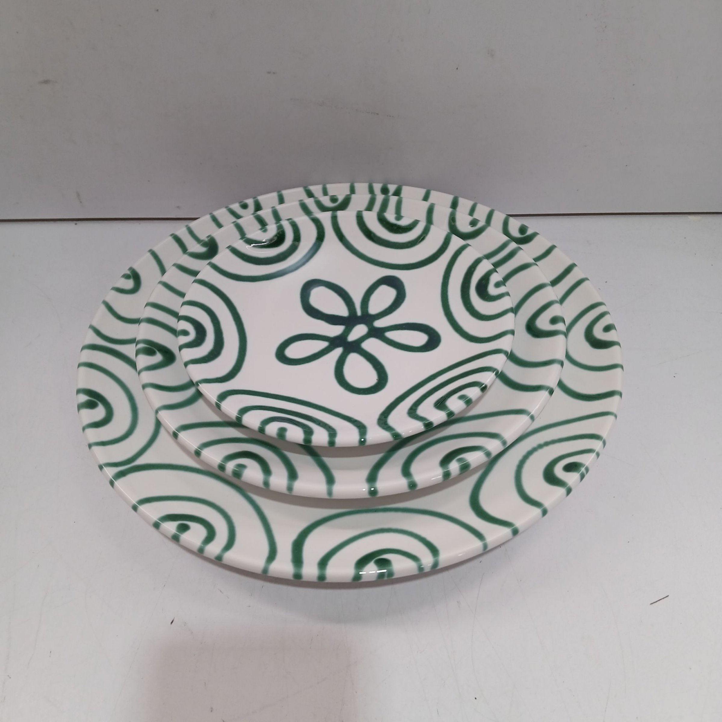1 Set Gmundner Keramik Set Grüngeflammt 1x Speiseteller, 1x Dessertteller, 1x Unterteller