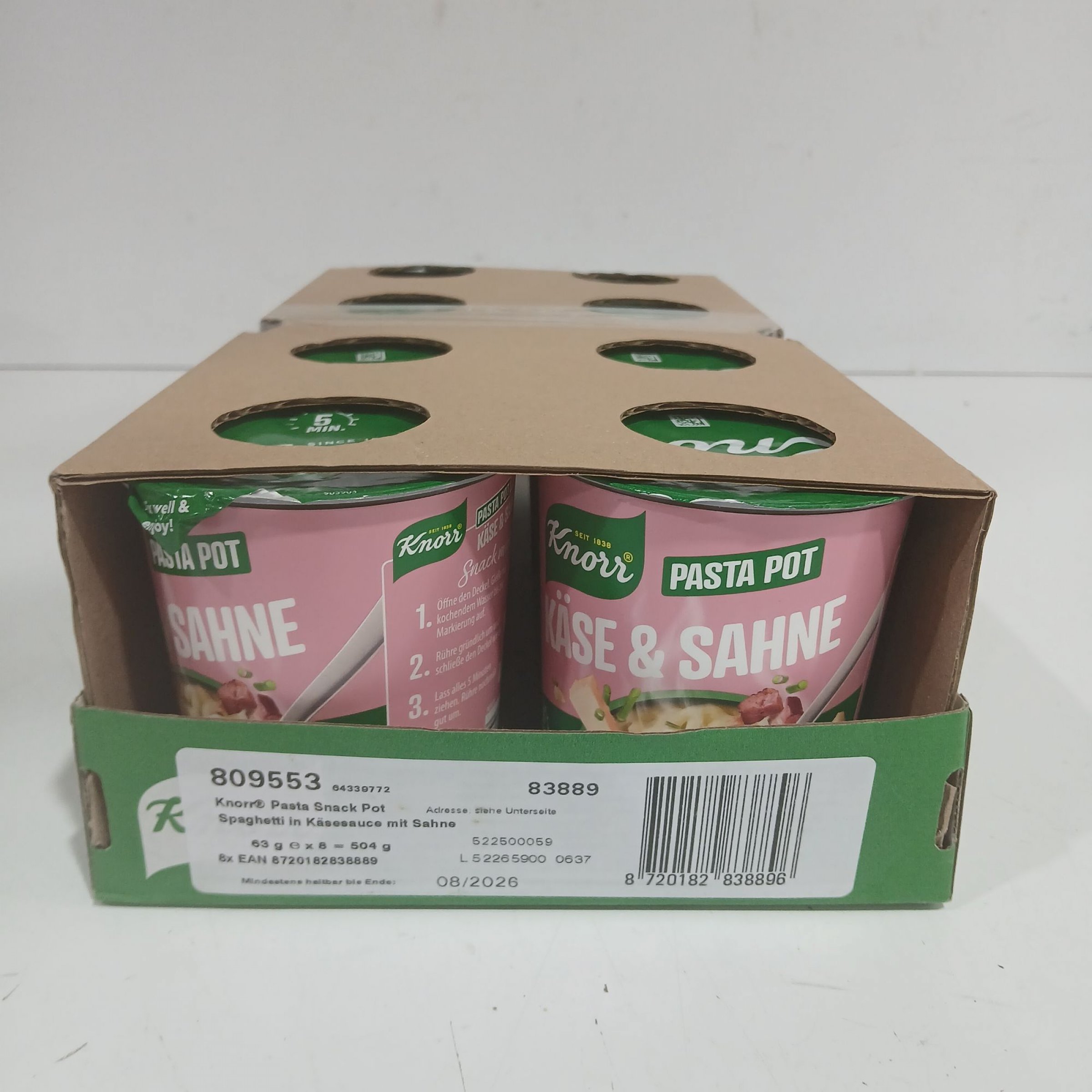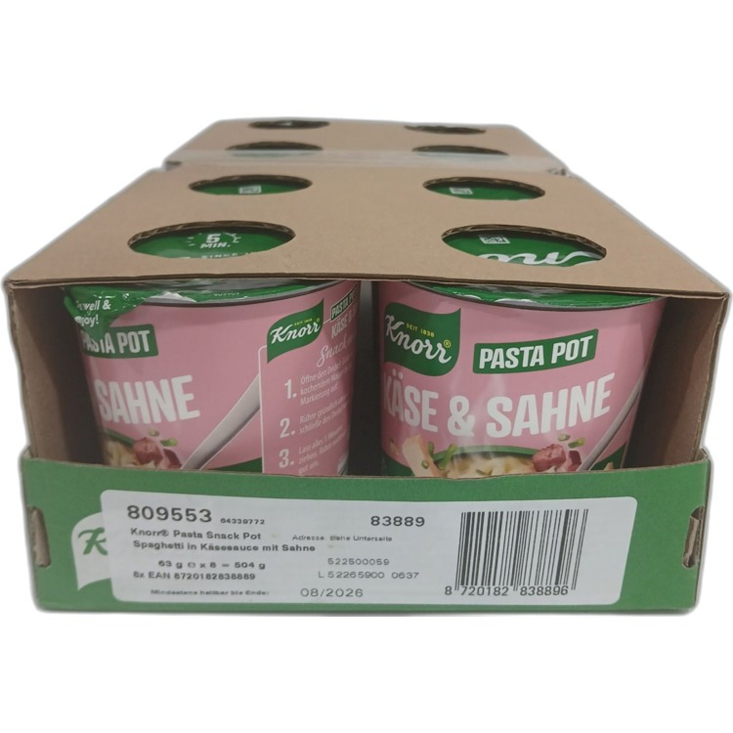 1 Packung Knorr Pasta Snack Pot Käse&Sahne 8x63g