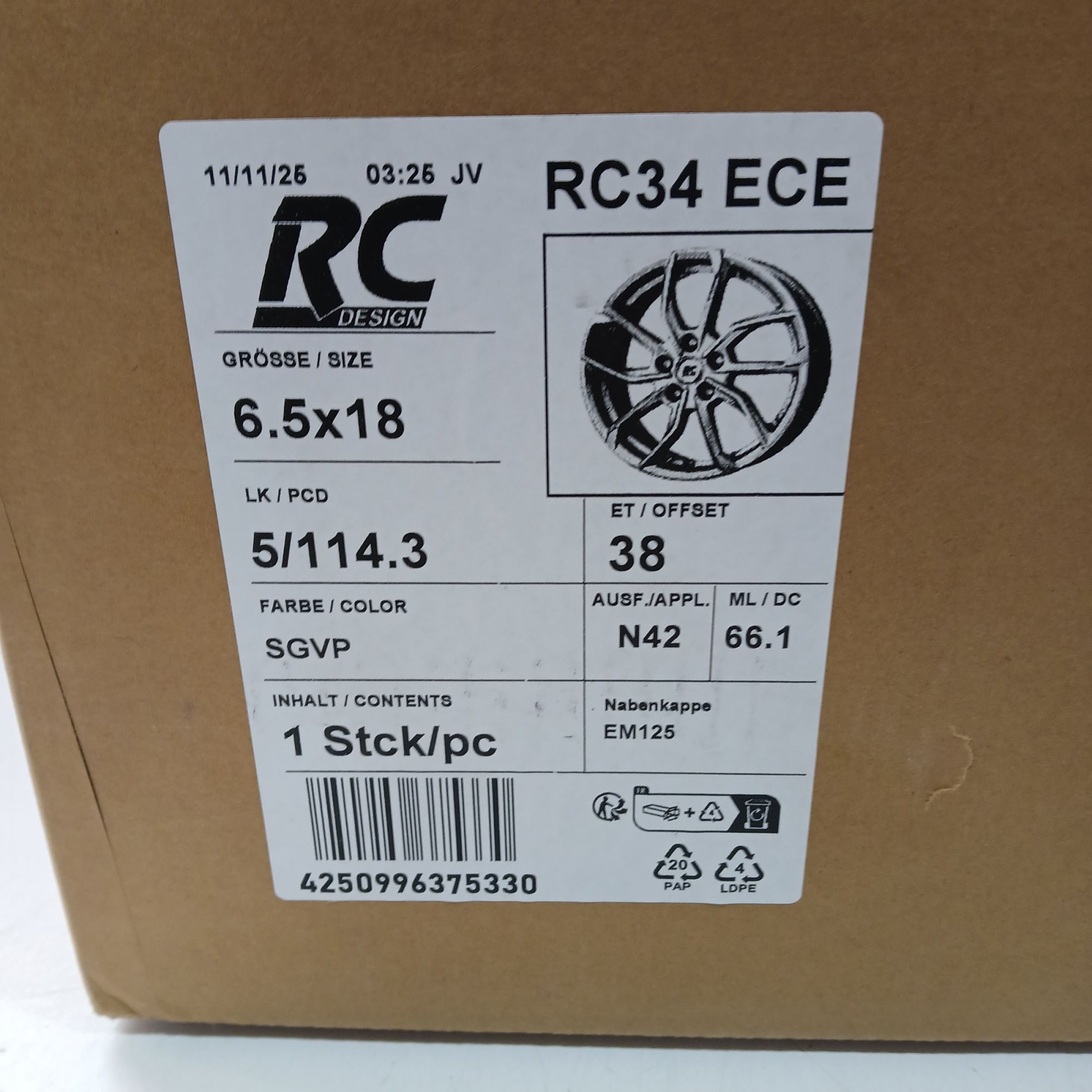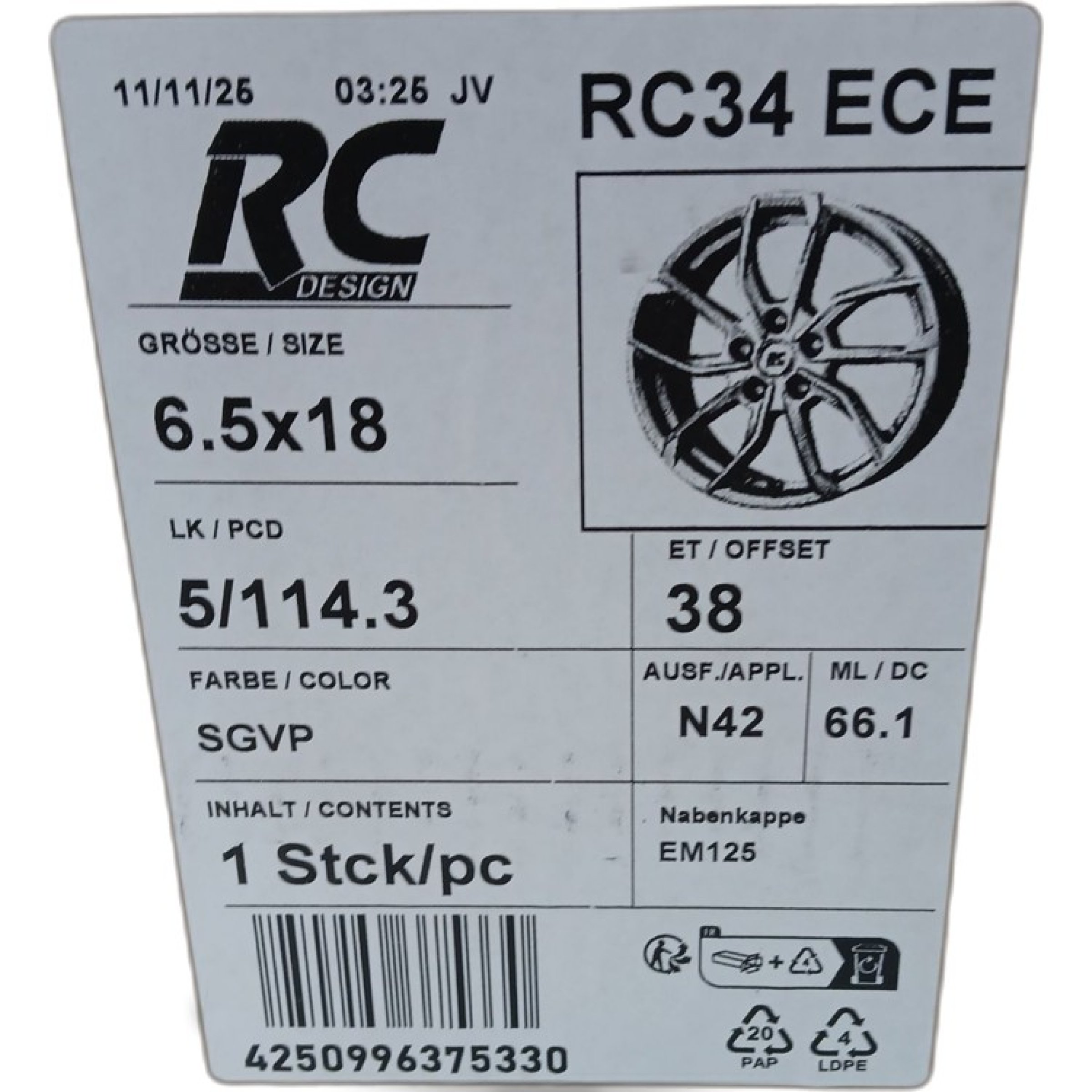 1 Stk. BROCK RC34 ECE 6.5JX18 5/114.3 ET38 ML 66.1