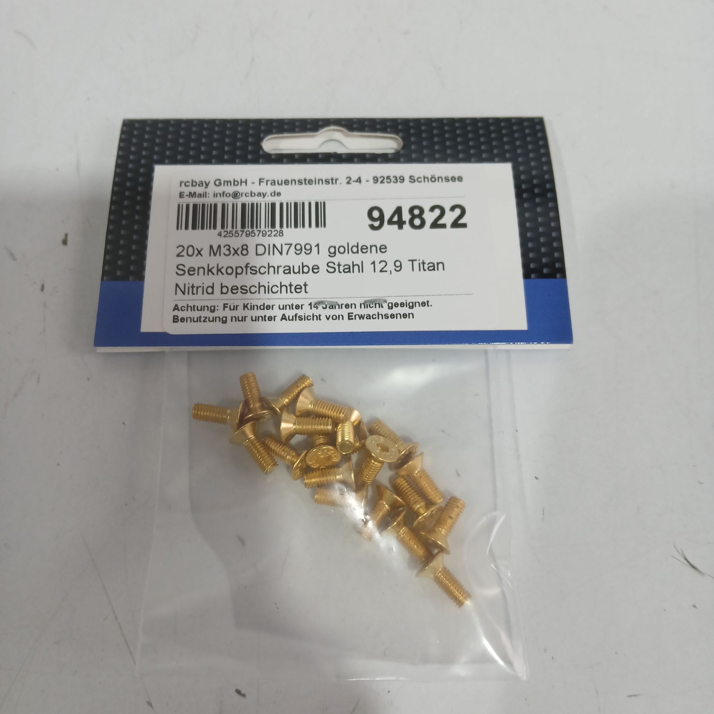 1 Stk. Rcbay Senkkopfschraube Stahl 12,9 Titan Nitrid beschichtet 20x M3x8 DIN7991