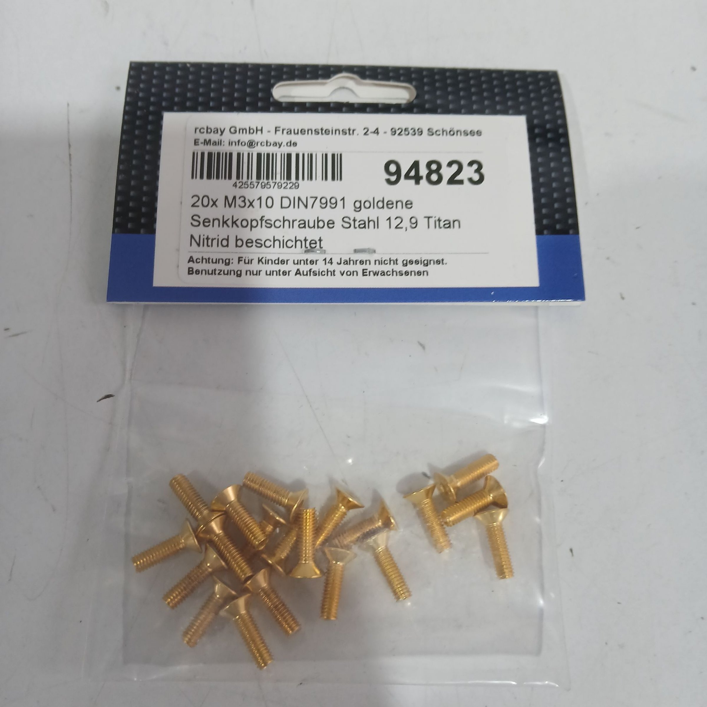 1 Stk. Rcbay Senkkopfschraube Stahl 12,9 Titan Nitrid beschichtet 20x M3x10 DIN7991