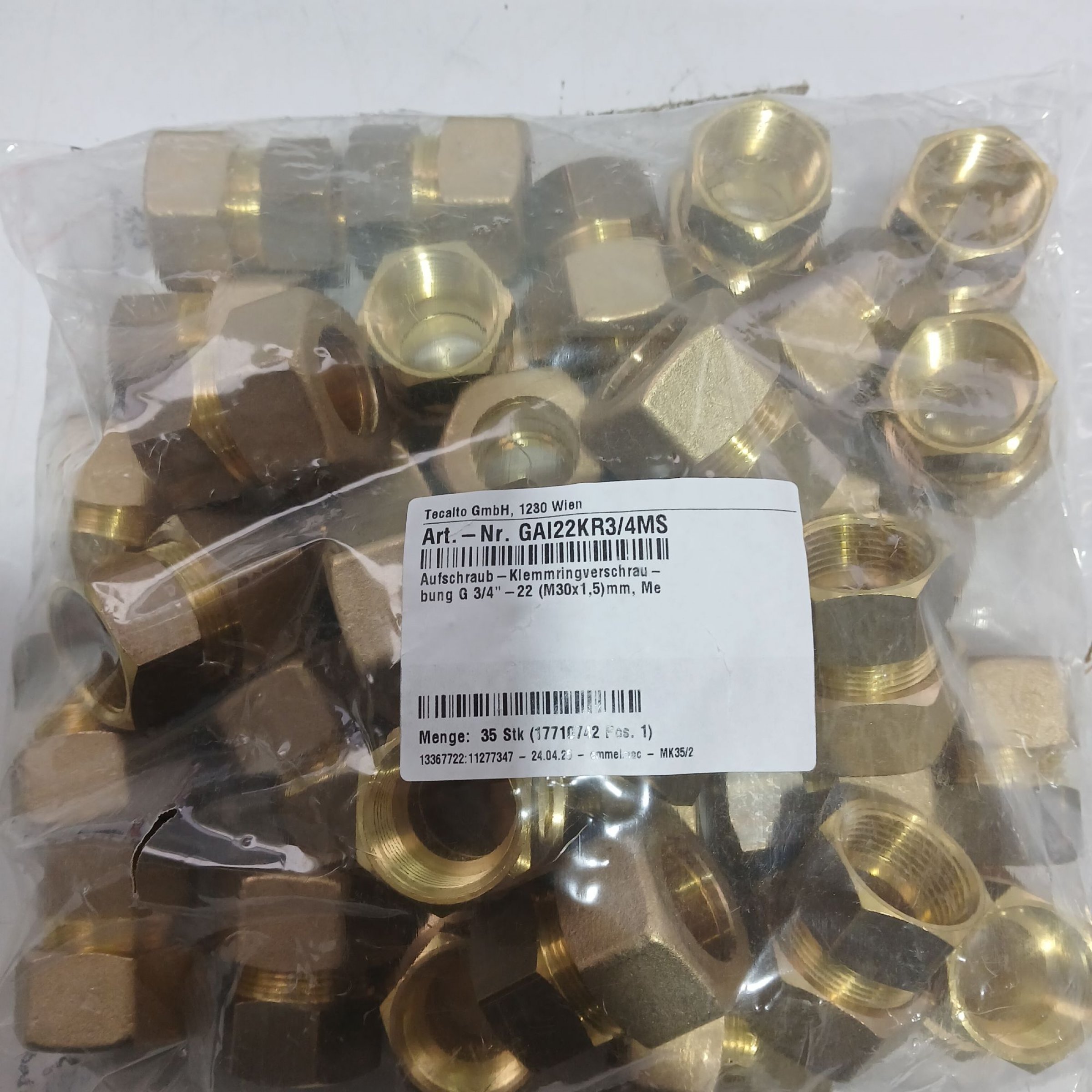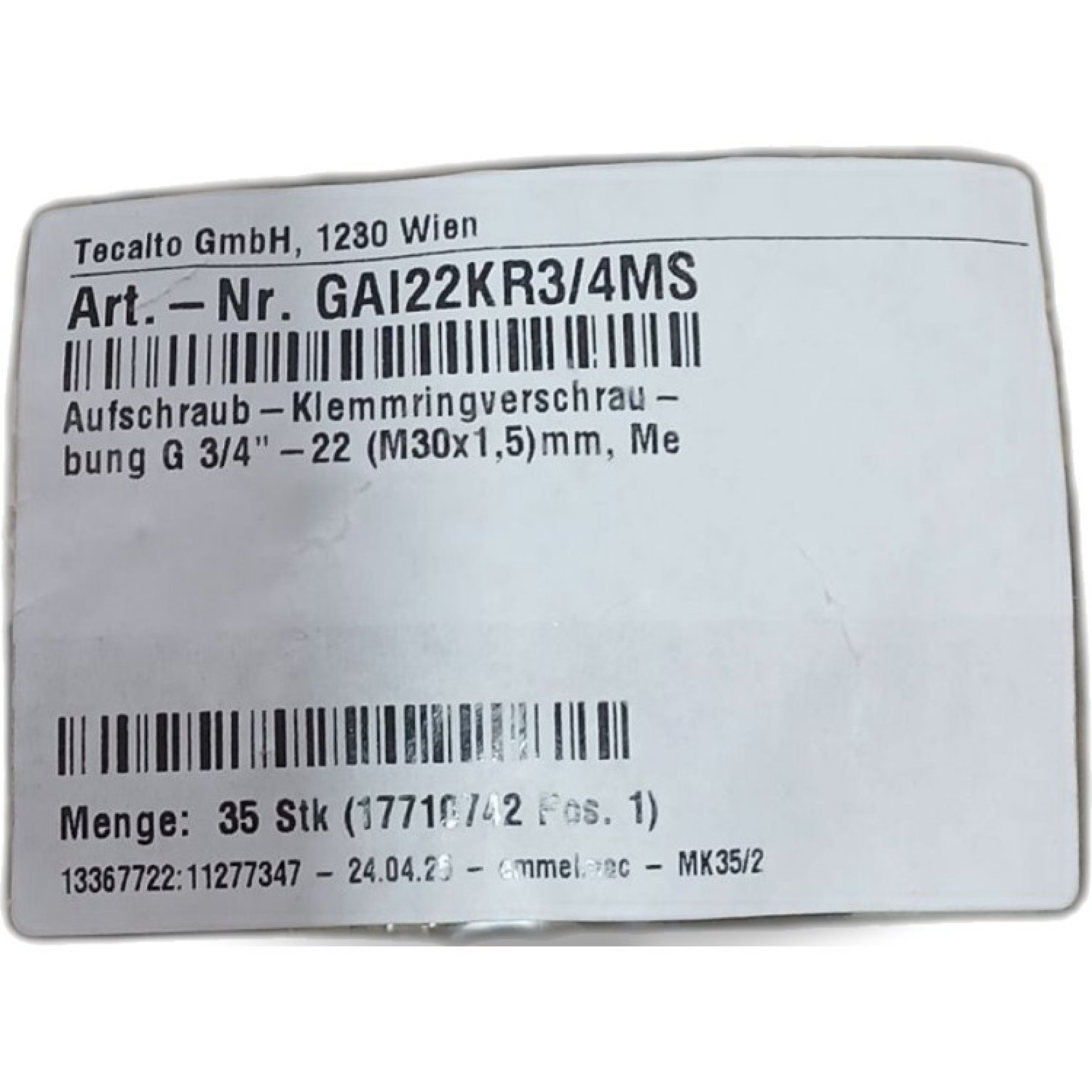 1 Packung Aufschraub-Klemmringverschrau M30x1,5mm 35Stk Art.Nr: GAI22KR3/4MS